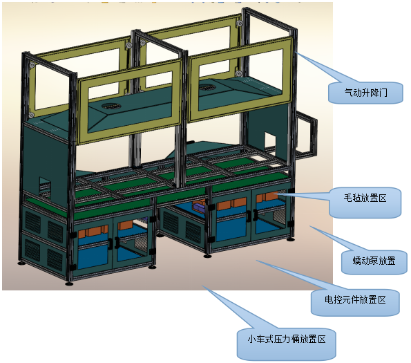 1)主机架构成:主体采用50铝型材框架结构,工作台上部,前后均为升降式